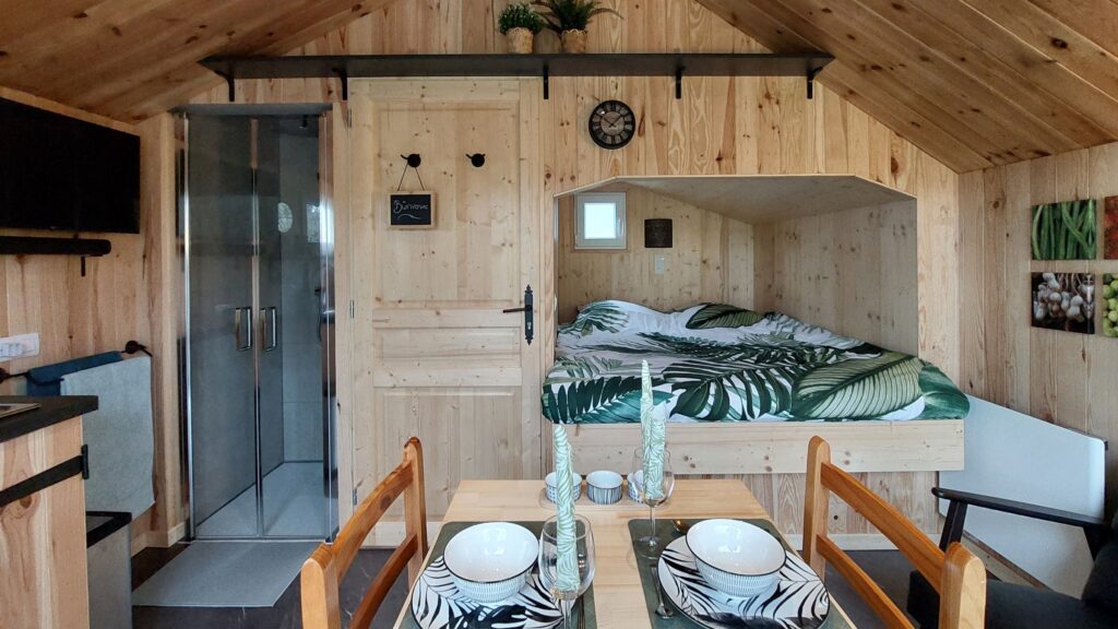 - In de leefruimte staan een tafeltje en twee stoelen, bankje en hangkast. Aan wand hangen enkele legplanken, een televisie met soundbar en een elektrisch kacheltje.