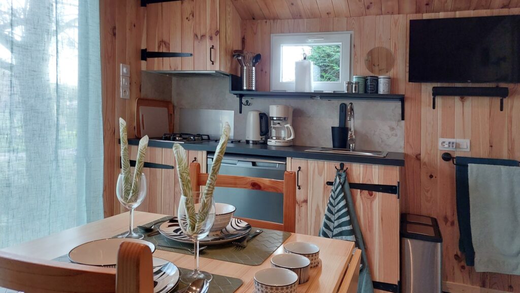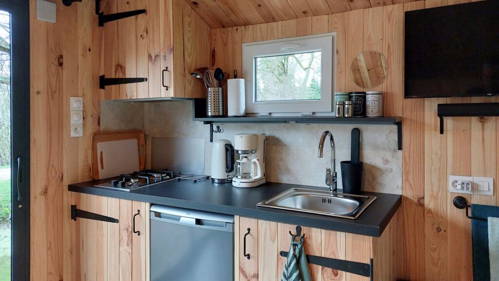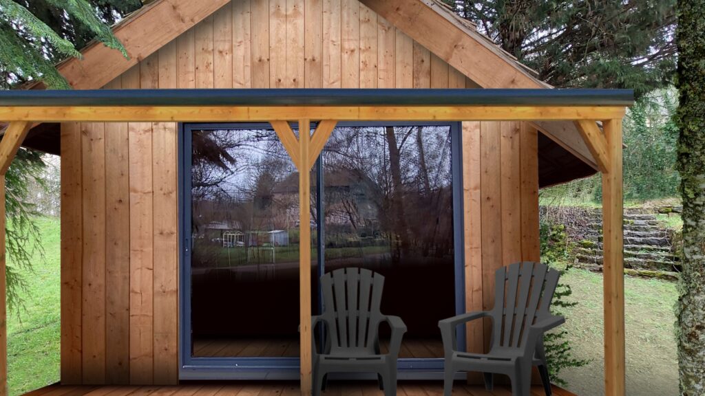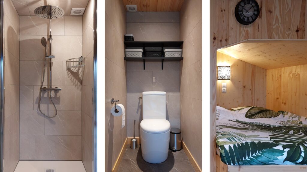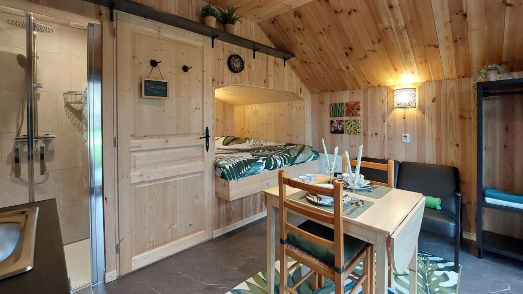 Onze studio ‘La Cabane’ is een houten chalet. De blokhut is geïsoleerd en van alle gemakken voorzien. Je zou het ook een luxe trekkershut kunnen noemen. ‘La Cabane’ is volgt ingedeeld: